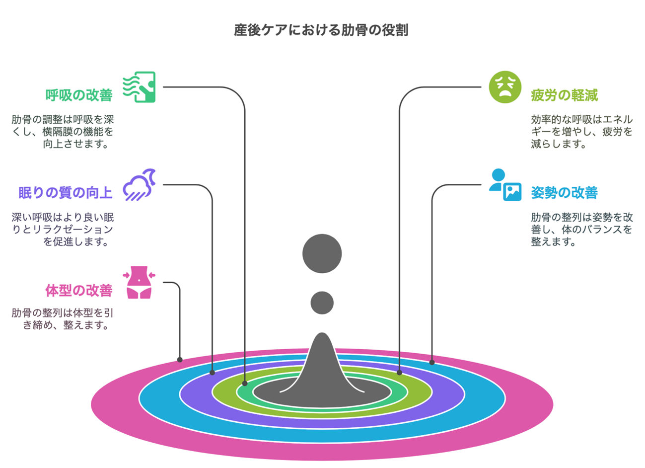 妊娠・出産によって骨盤だけでなく、実は肋骨も大きく開いてしまいます。 この肋骨が開いたままだと、深く呼吸ができなくなり、内臓が正しい位置に戻りにくくなります。 その結果、疲れやすさや眠りの浅さといった不調が慢性的に続いてしまうのです。 また肋骨に付着する横隔膜の動きが悪くなることでお腹に力が入りにくくなり、反り腰や尿漏れなどの深刻なトラブルを引き起こす原因にもなります。 そして、何よりママが気にしている体型が崩れてしまう大きな要因にもなっています。