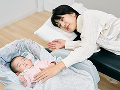 0~1歳のお子さんはバウンサーで受付スタッフがしっかりとお預かりしますのでご安心ください。もちろん、施術ベッドの隣にお子さまと一緒にいていただくことも可能です。ご希望があれば、遠慮なくお伝えください。